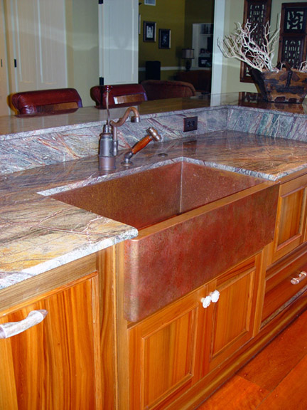 Sinker Cypress kitchen in the Spring Hill area of Mobile, Alabama. Features Rachiele copper sink, unique owner provided natural antler decorative pulls and knobs, and marble countertops.